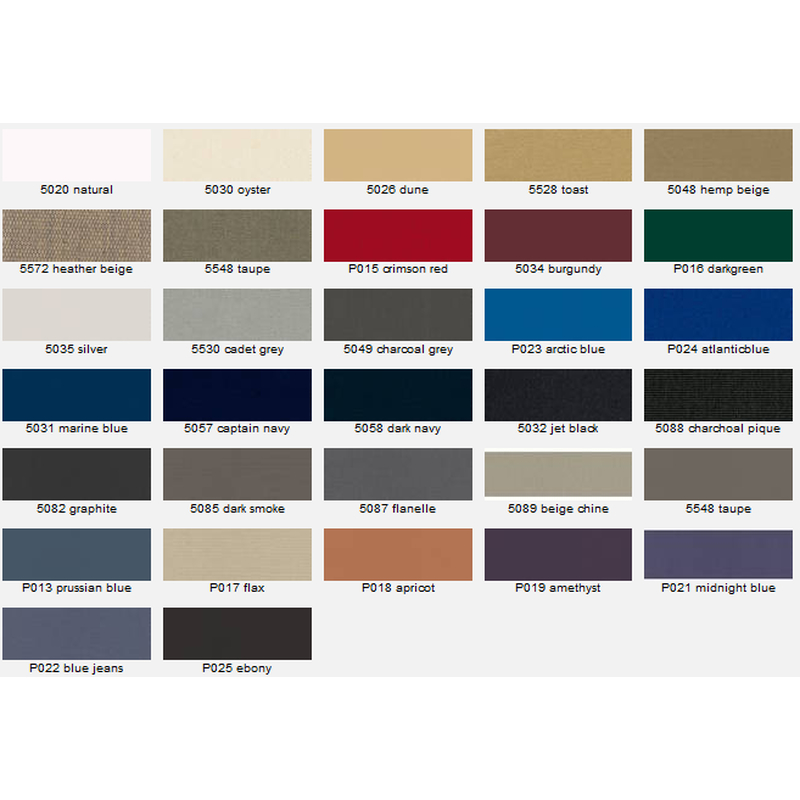 Das Tuch wird aus Sunbrella oder Sauleda hergestellt. Unten finden Sie die verfügbaren Farben. Sollte das gewünschte Material oder die Farbe nicht aufgelistet sein, so fragen Sie bitte bei uns an.