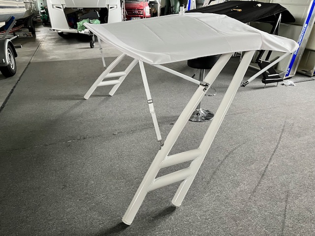 Das Bimini ist bereits montiert. Das Bimini wurde mit weißen Alustangen angefertigt. Alle Beschläge sind aus Edelstahl.