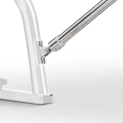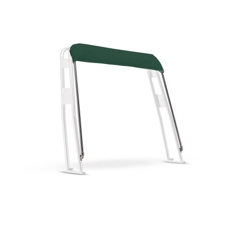 Das Bimini wird unten am Geräteträger befestigt (siehe Bild). Die Rohre sind teleskopierbar und werden beim Aufspannen ausgefahren. Wenn das Bimini eingeklappt wird, dann werden die Teleskoprohre zusammengefahren und das Bimini liegt direkt am Geräteträger an.