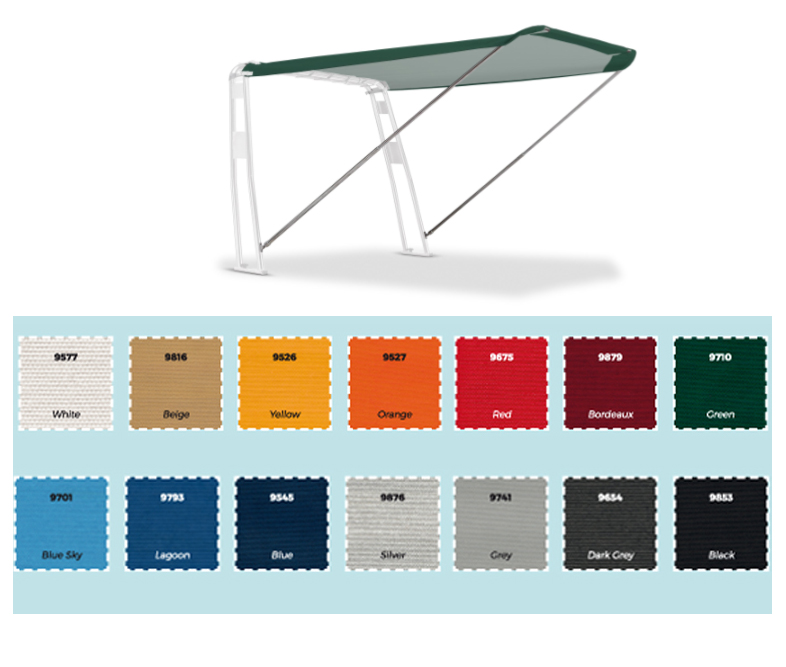 Hier können wir ihnen ein spezielles Bimini Top anbieten, das direkt an einen Geräteträger anschliesst. Das Bimini ist speziell für diese Art von Geräteträger hergestellt. Der Durchmesser des Geräteträgers spielt hier keine Rolle.