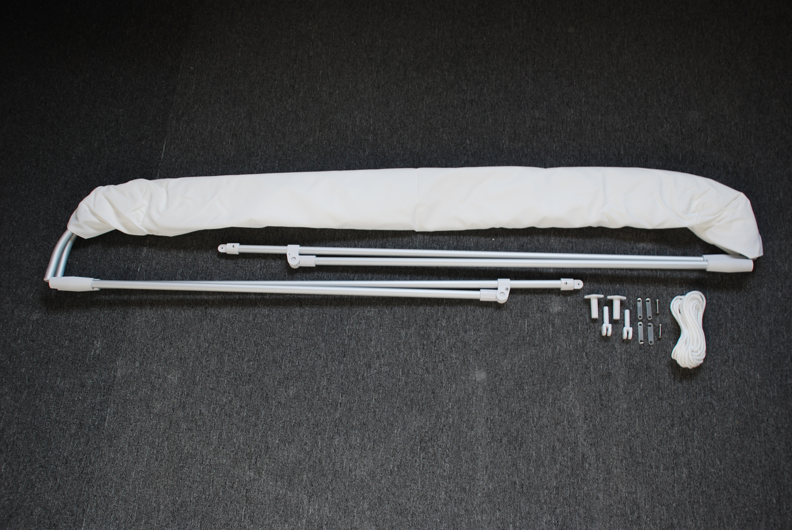 Das Gestänge des Bimini Top ist aus 20mm Aluminium hergestellt. Das Bimini wird mit 4 Abspanngurten abgespannt. Ein Schutzsack ist ebenfalls im Lieferumfang enthalten.