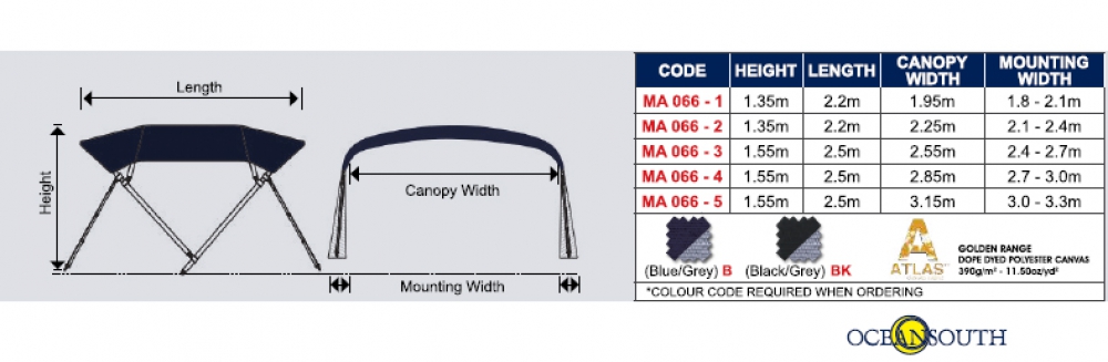 Die Verdeckslänge beträgt 250cm. bei den Breiten 240-270cm, 270-300cm, 300-330cm.
