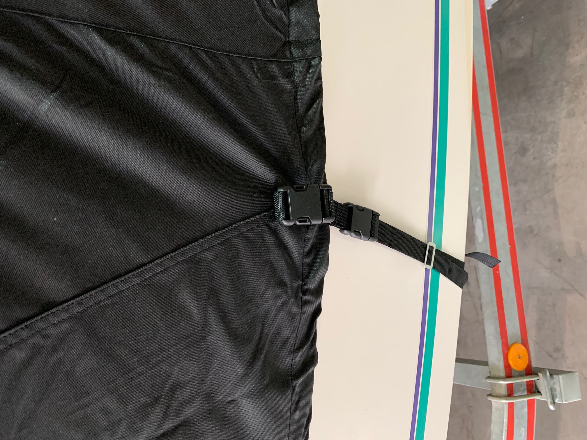Die Persenning ist aus 600D Polyester. Die Persenning wird mit Gurten abgespannt. Diese können auch noch zusätzlich über und unter dem Boot gespannt werden. Seitlich und am Heck sind Spanngurte um die Persenning unter der Scheuerleiste zu straffen.