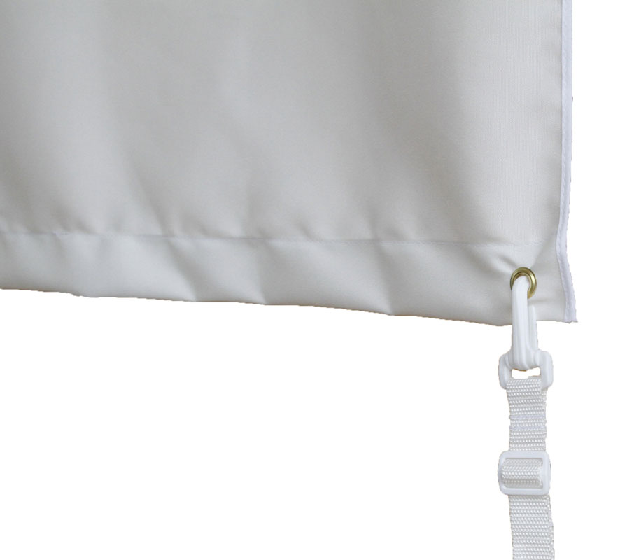 Der Schirm hat an allen Ecken D-Ringe und wird mit vier verstellbaren Bändern am Boot befestigt und verspannt. Der Schirm ist in der Höhe verstellbar.