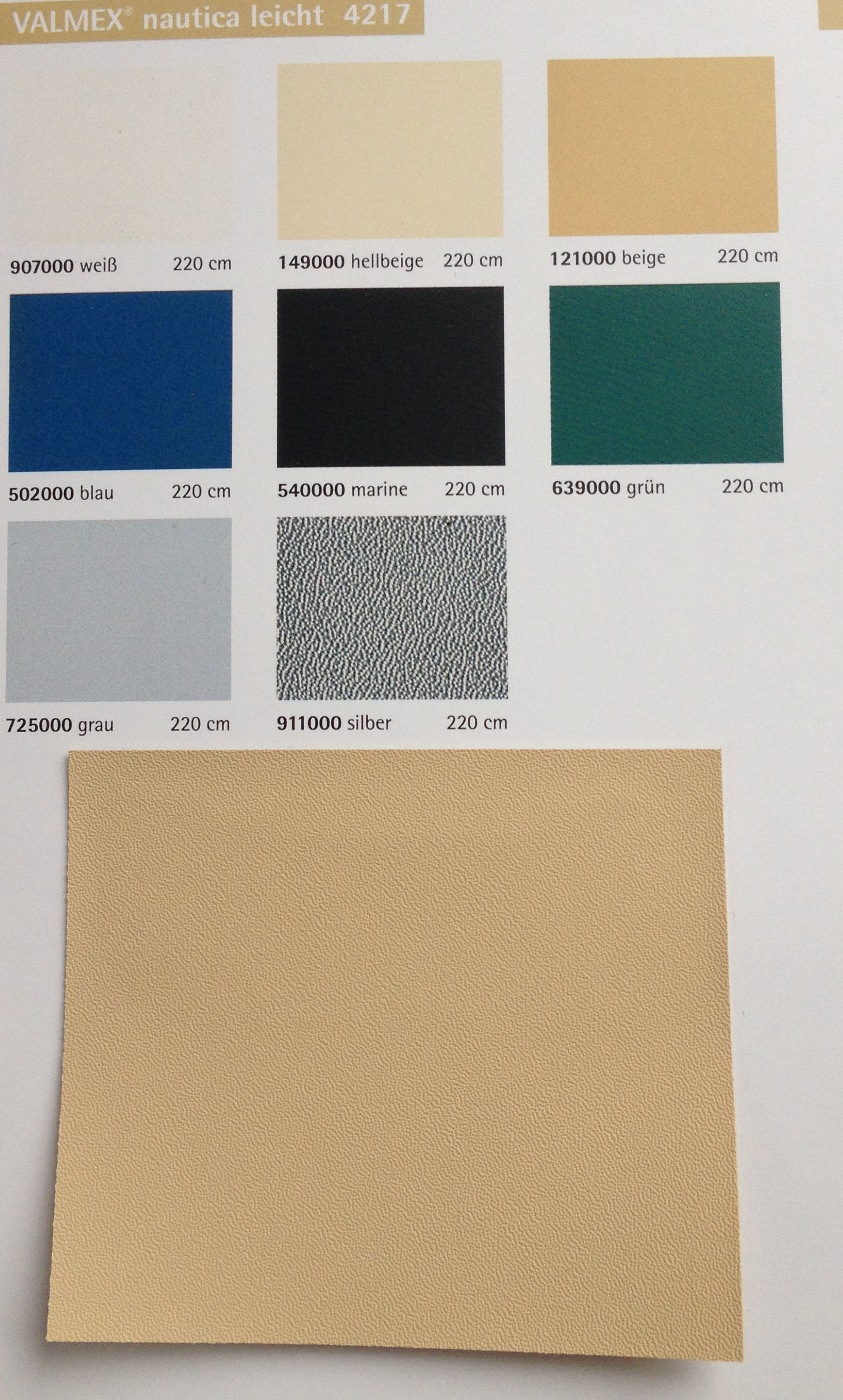 Valmex Nautica Leicht beidseitig ist ein beidseitig PVC-beschichteter Stoff. Das Material ist UV-, Salzwasser- und Möwenkotbeständig und verfügt über eine fäulnishemmende Ausrüstung in der Beschichtung. Das Material kann ebenso auch verschweisst werden.