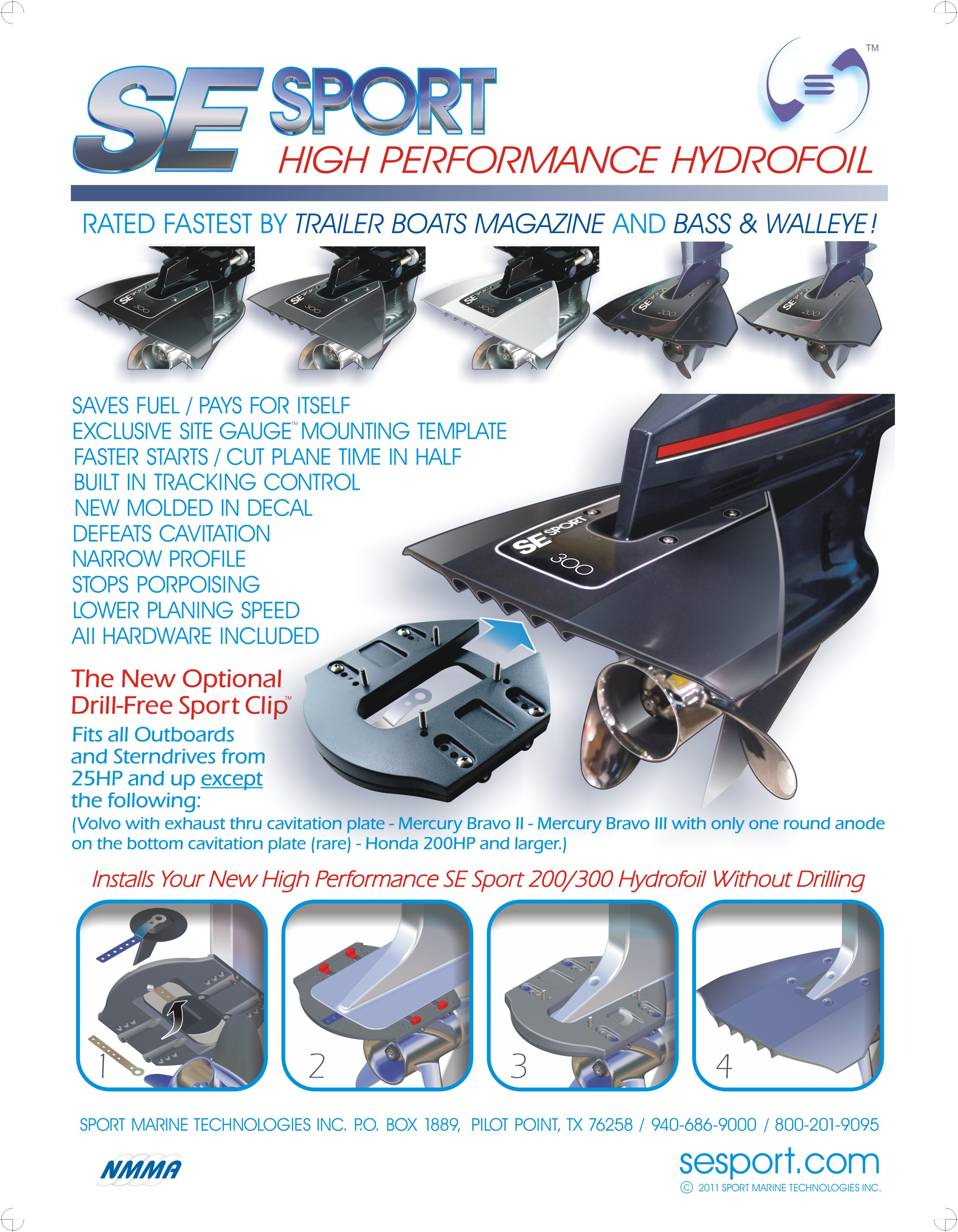 Alle Größen mit einer Kavitationsplatte, die breiter als 12,7 cm ist, gewöhnlich mit 40 PS und mehr. Da die Befestigungslöcher am SE Sport 300 10,16 cm von Mitte rechtes Loch bis Mitte linkes Loch auseinander sind, würde eine 12,70 cm breite Kavitationsplatte weniger als 1,3 cm Metall zwischen Lochrand und Plattenrand lassen. Das SE Sport 200 empfiehlt sich für Kavitationsplatten unter 12,50 cm Breite.