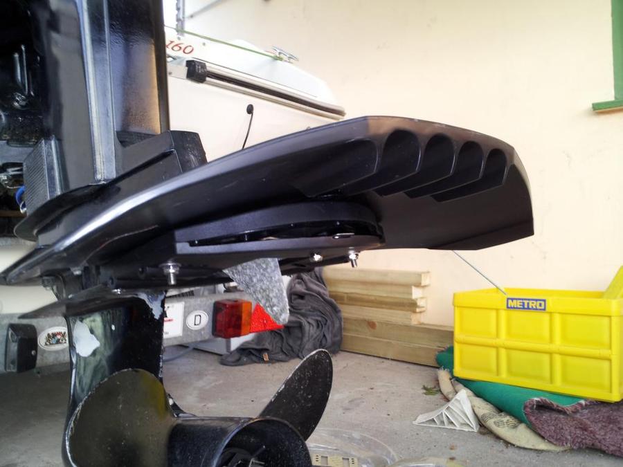 Viele Außenborder von Honda sind mit einer Mittelfurche für die Kavitationsplatte versehen. Einige Hondas erfordern die Herstellung einer kleineren Kerbe oder größeren Ausfräsung im Joch des Hydrofoil. Damit schaffen Sie 1,3 cm "Luft" zwischen den rückwärtigen, noch zu bohrenden Löchern und dem Ende der Kavitationsplatte. Das können Sie leicht mit einer kleinen Säge oder einer Feile herstellen; es beeinflusst nicht die Lebensdauer oder Gewährleistung des SE Sport.